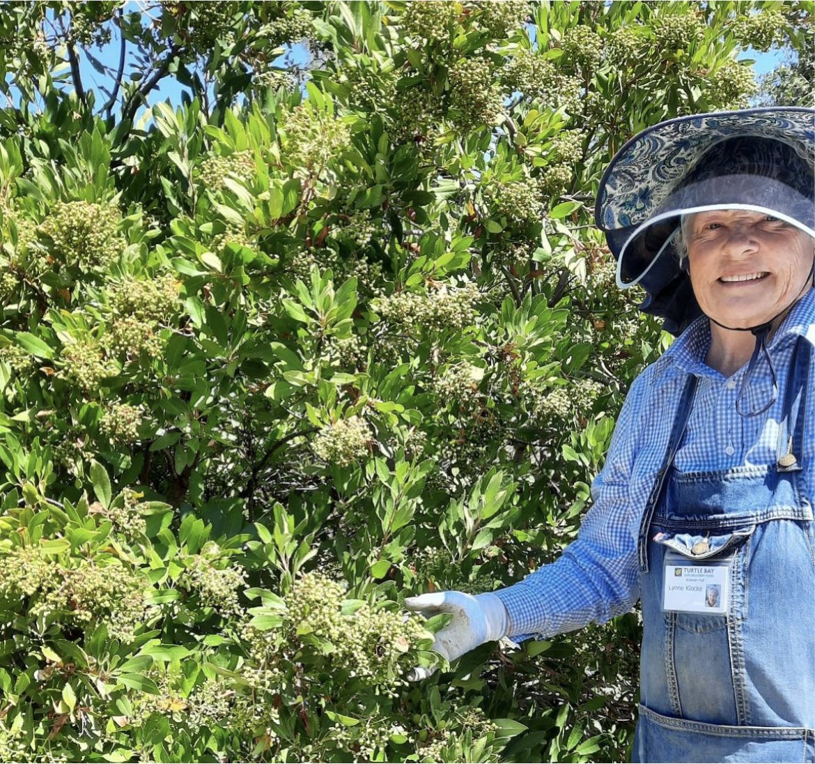 Nursery Specialist, Lynne Klocke, next to a mature Toyon with immature berries growing by the Willow Pond at Turtle Bay